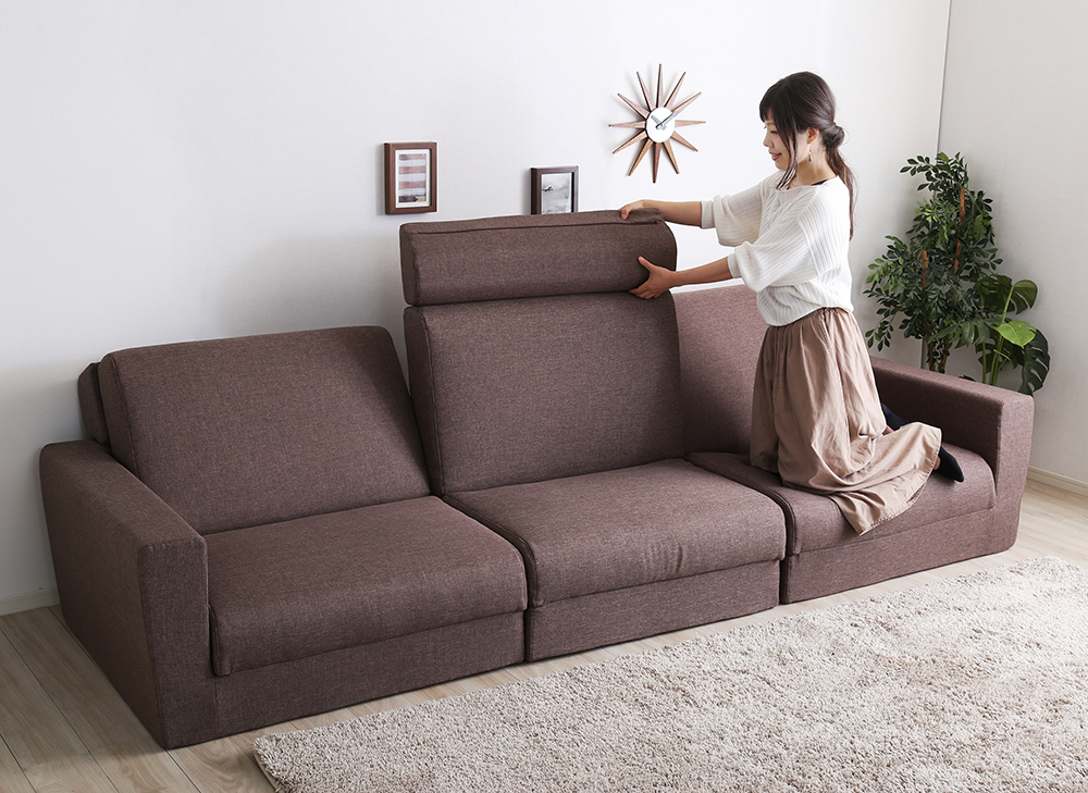 - 組み換え自由なソファベッド 3人掛 日本製 ローベッド カウチソファ 布張りブラウン色