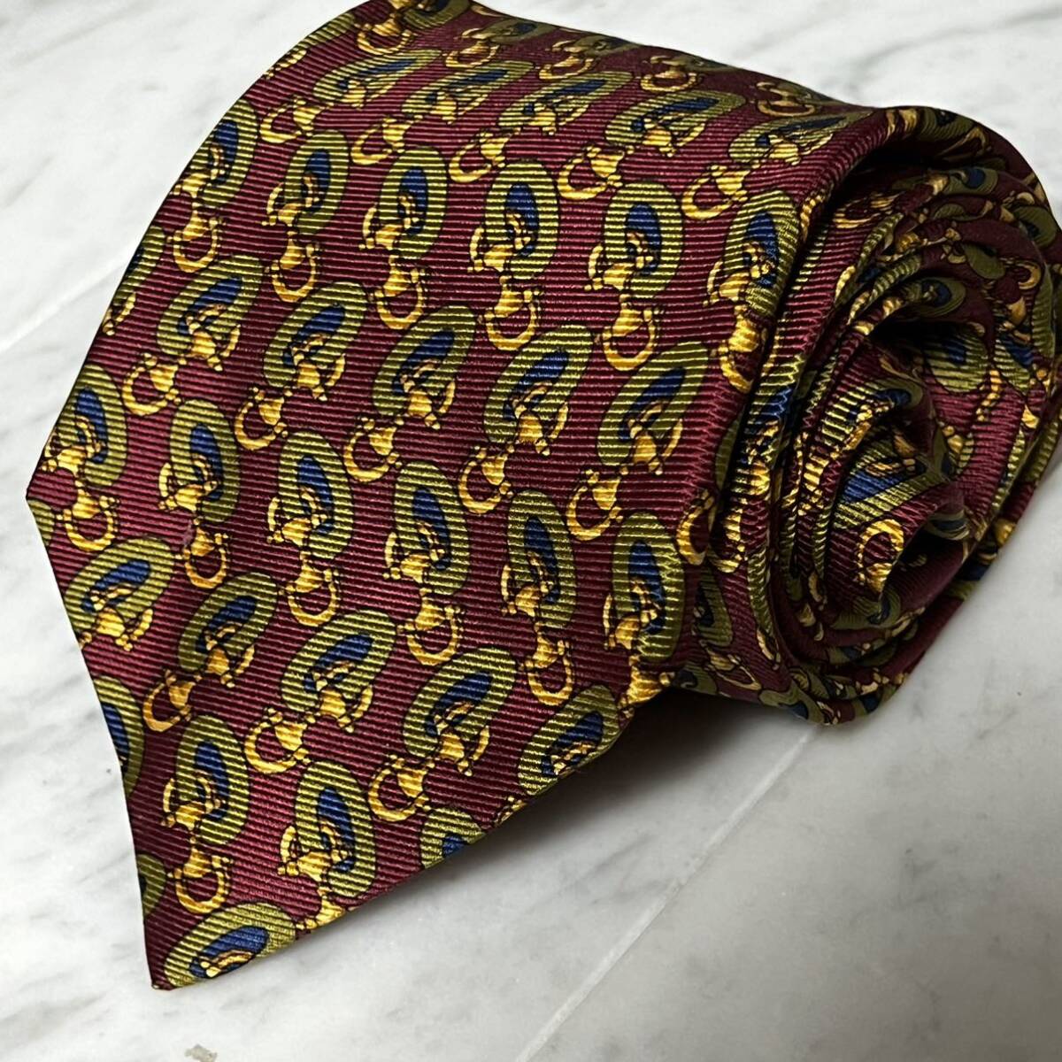 - 【美品】 999円~ CELINE ネクタイ レッド系 金具 ネイビー カーキ 総柄 (R5)