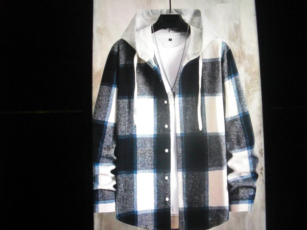 - フード付き長袖チェックシャツ(黒×白×グレー×青)3XL・チカーノ・ローライダー・ギャングスタ・メキスタイル・HIPHOP