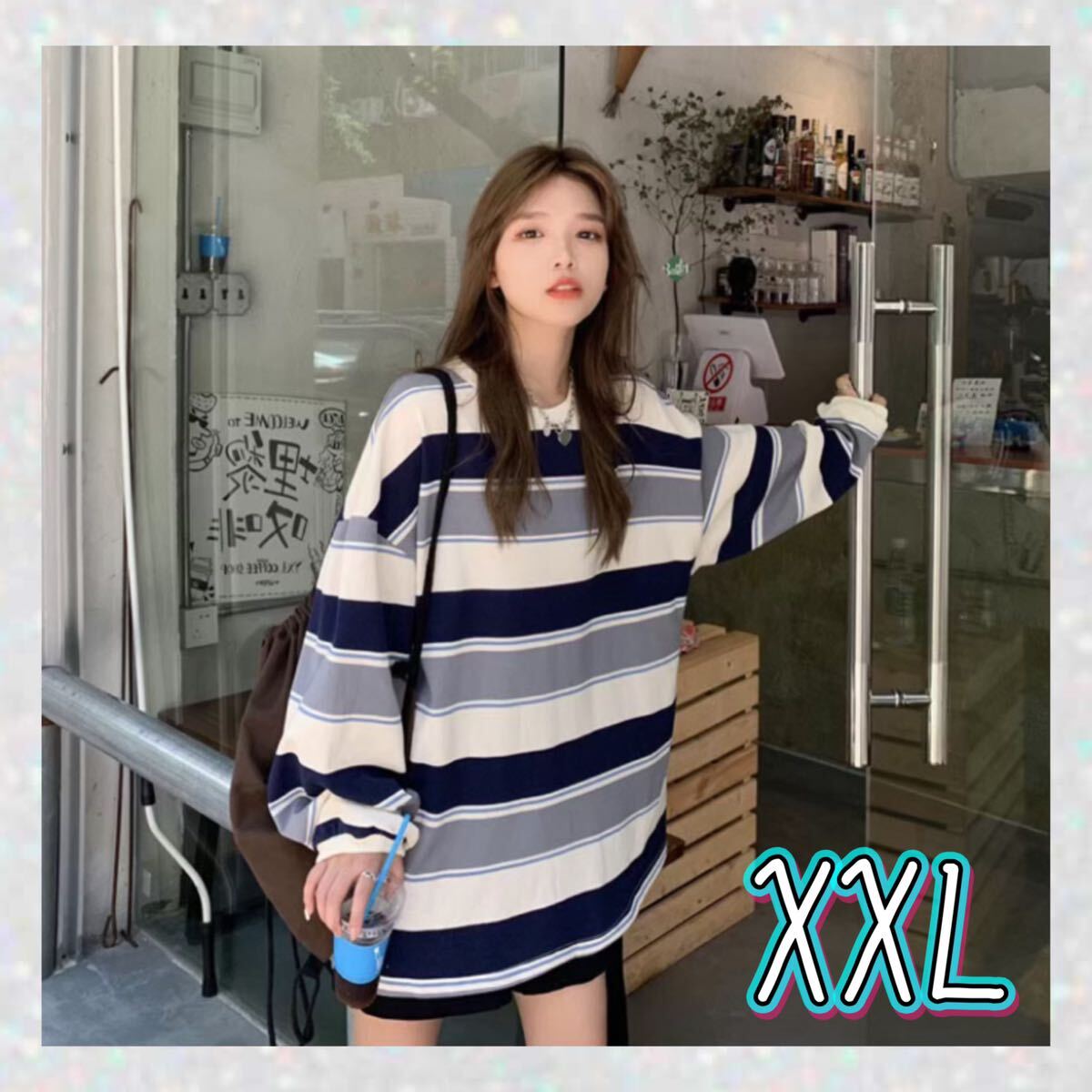 - ボーダー ロング Tシャツ 長袖 ゆったりドロップショルダー レディース