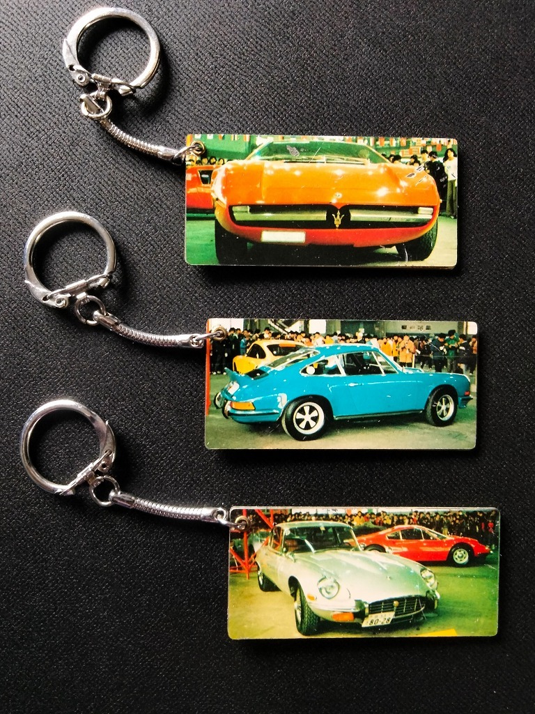 - '70s 当時物 スーパーカー キーホルダー 未使用 3pセット ポルシェ カレラ カウンタック フェラーリ!☆ 金属製プレート 5台付き 旧車②