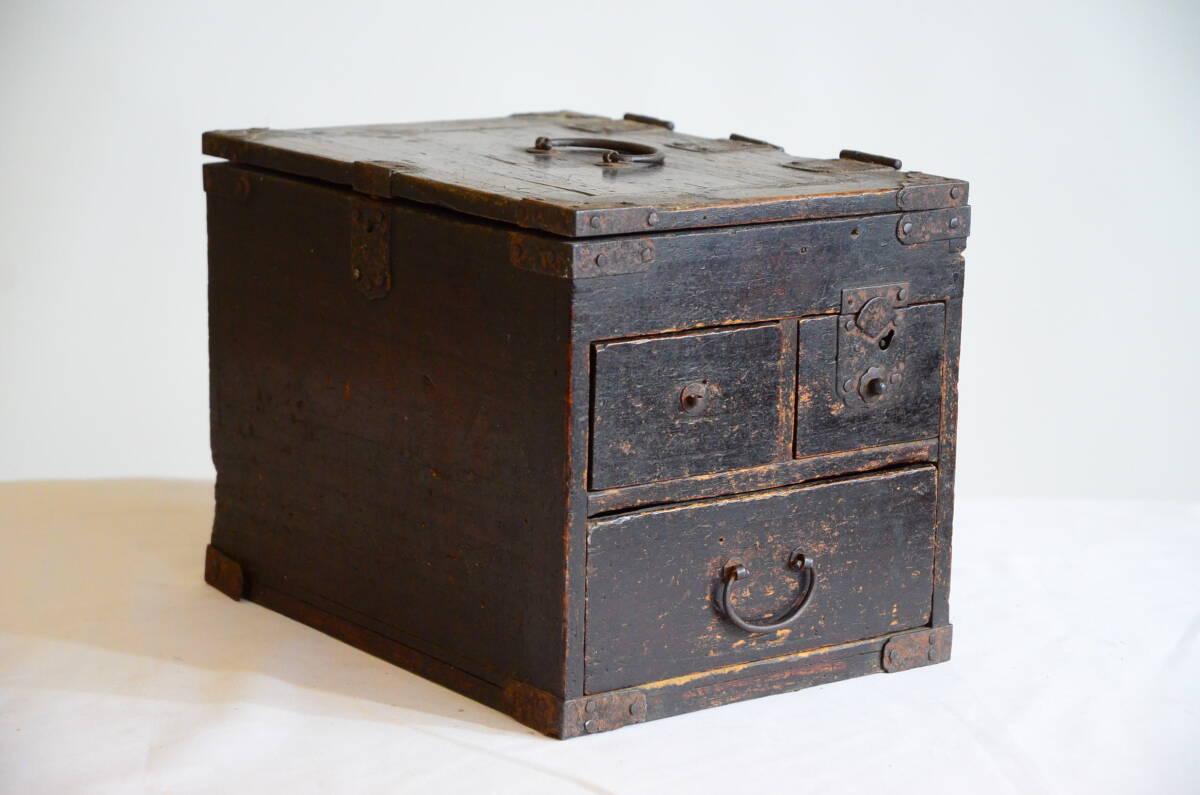 アンティーク 筆箱 小物入れ 引き出し 金具付き 銭箱 古民具 骨董 当時物 縦24cm 横24cm 奥行32cm