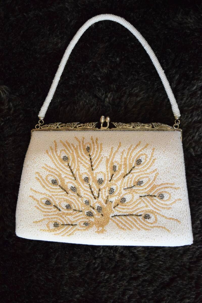 - ★レトロ 和装小物 ビーズバッグ 孔雀柄 ハンドバッグ 手提げバッグ★中古品