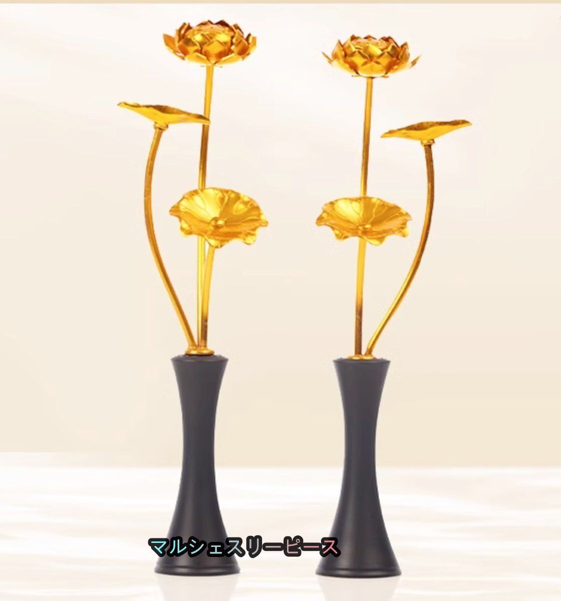 - 唐密真言宗 蓮花 常花 アルミ製 2点セット 鍍金 花瓶付 仏教美術 高さ20cm