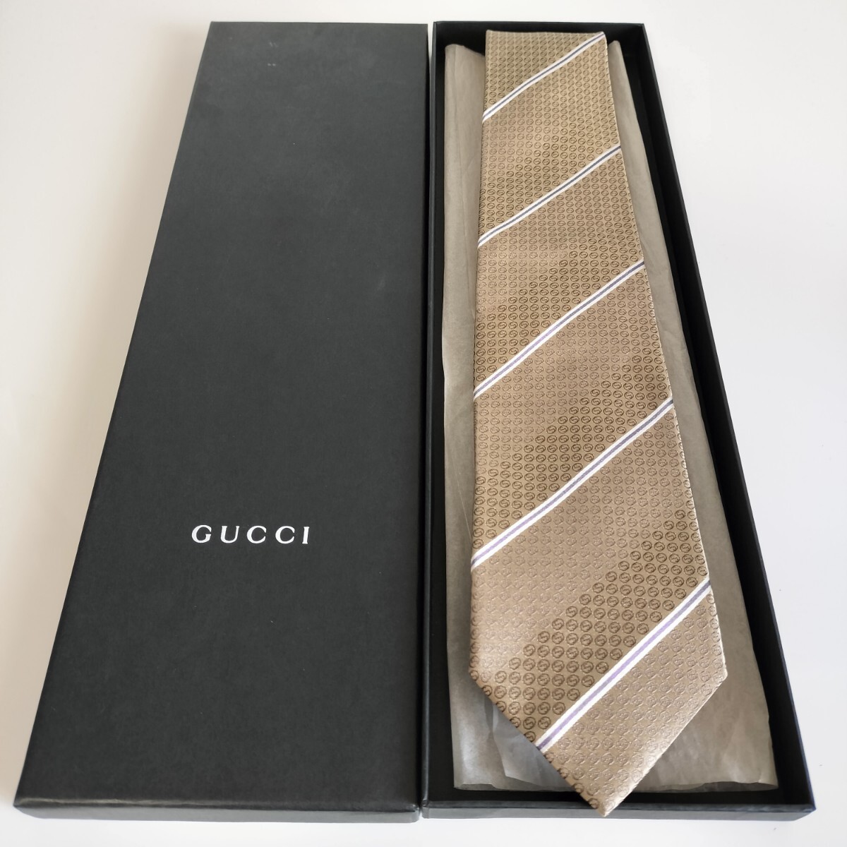 - グッチ(GUCCI)ベージュマイクロGGロゴ紫線ストライプネクタイ