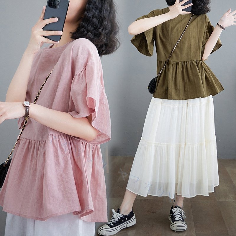 - ☆新品お色選択可 大人 上品 キレイめ トップス ブラウス カジュアル 大きいサイズ フレア袖 着やせ 大人 半袖 チュニック