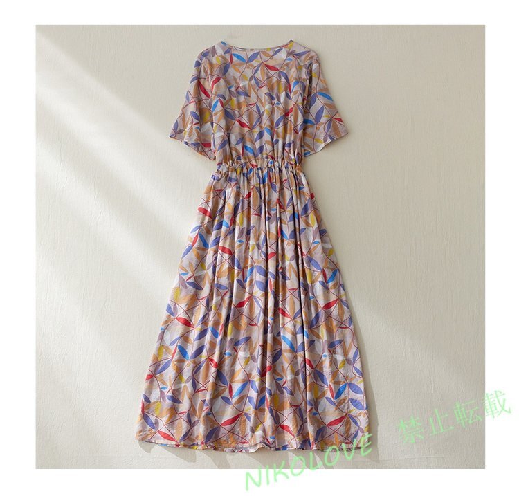 > 新品ゆったり大きいサイズ カジュアル 身を修めてやせて見える 丸首 カラフルな葉の模様 半袖 ワンピース 赤 LH333