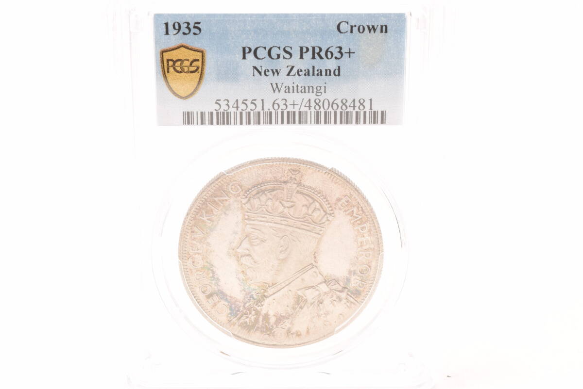 - ニュージーランド ジョージ5世(1910-1936) クラウン銀貨 1935 ワイタンギ条約及びジョージ5世在位25年記念 PCGS PR63+