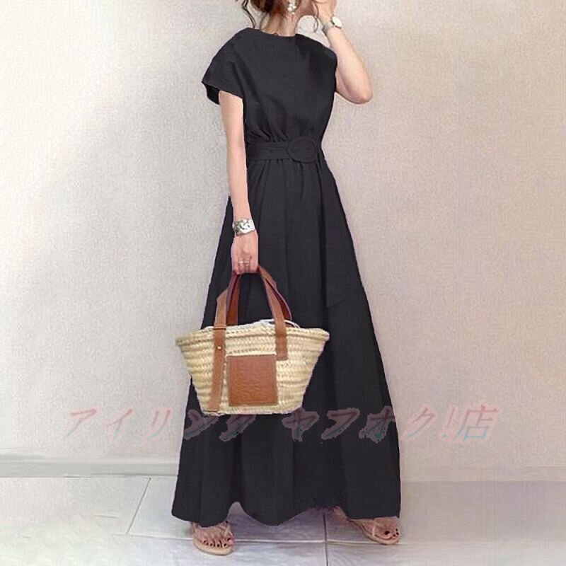 - ☆新品上質 ワンピース 半袖 ロングワンピース マキシ丈 シンプル ナチュラル きれいめ フレアワンピース ブラック