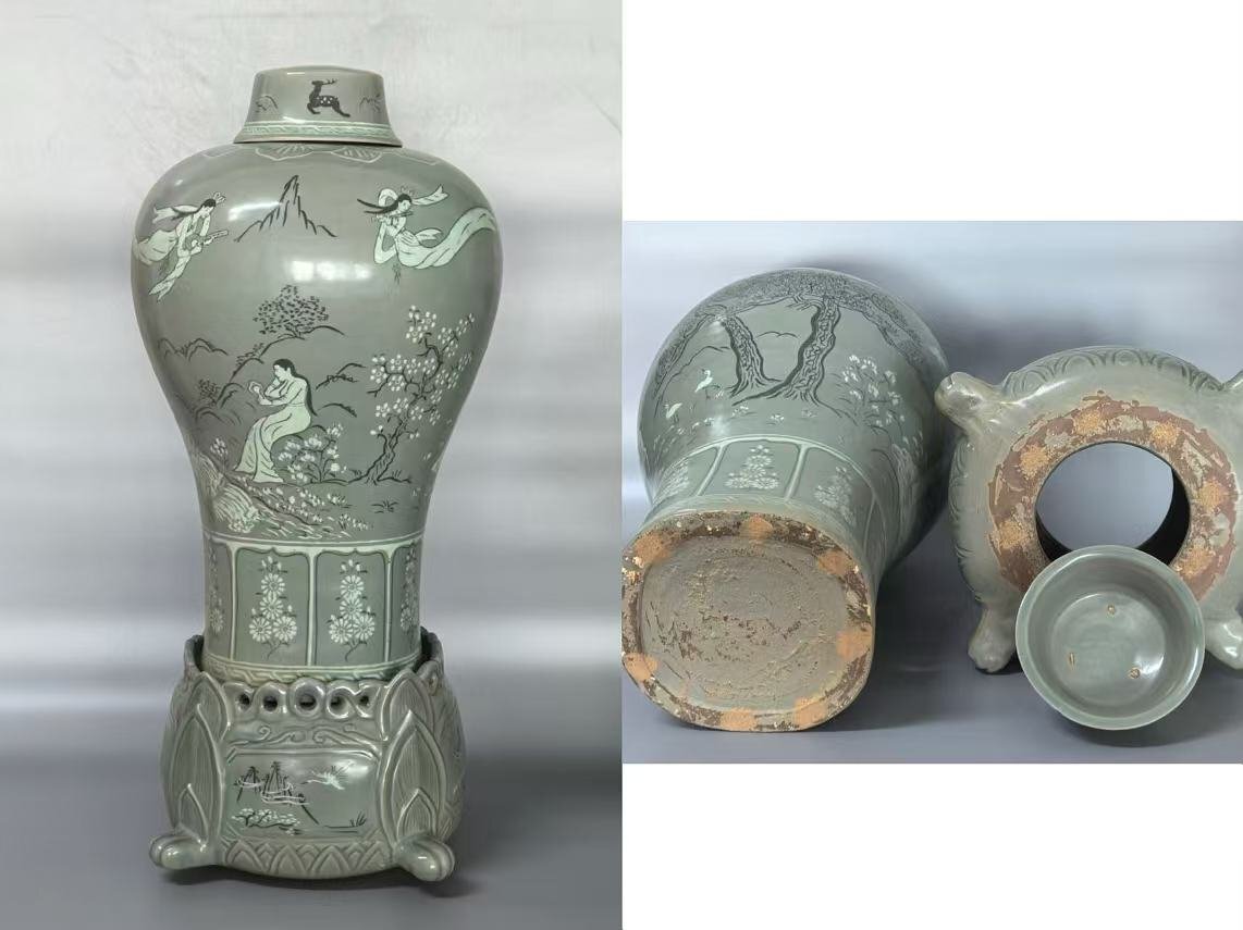 - ▼渡鶴羽▼P513 コレクター放出 朝鮮古美術 高麗磁 李朝時代 古高麗 高麗青磁人物大梅瓶