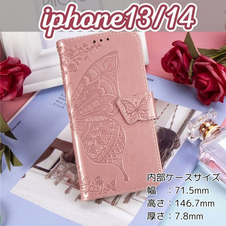 > iPhone 14 13 エンボスローズピンク蝶々手帳型ケース 高級PUレザー クレカ収納 スタンド機能付き マグネット留め具