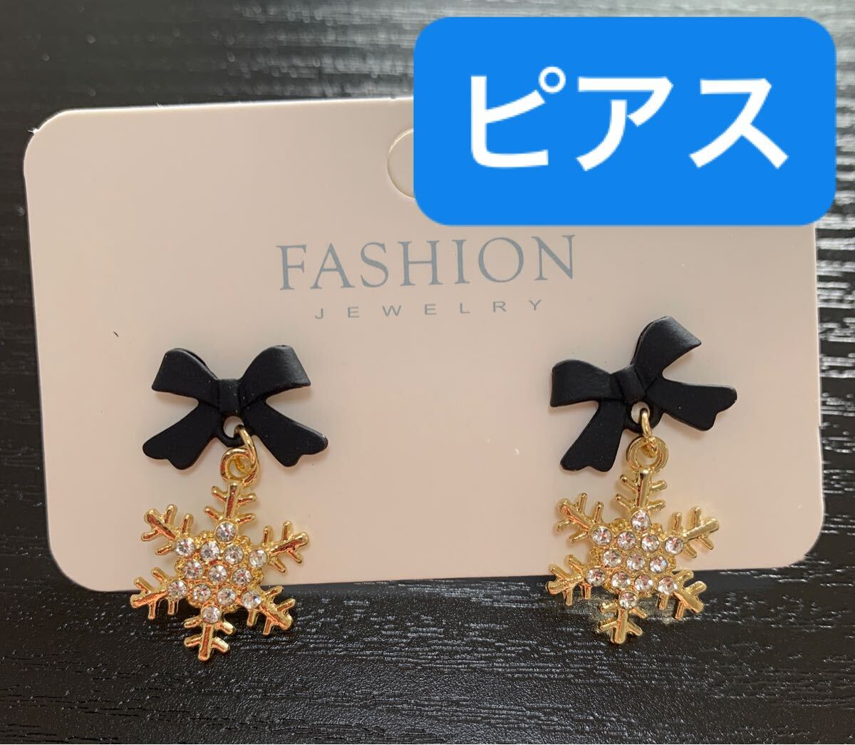 - ゆらゆら ラインストーン付き 雪の結晶 ブラック リボン ピアス ゴールド