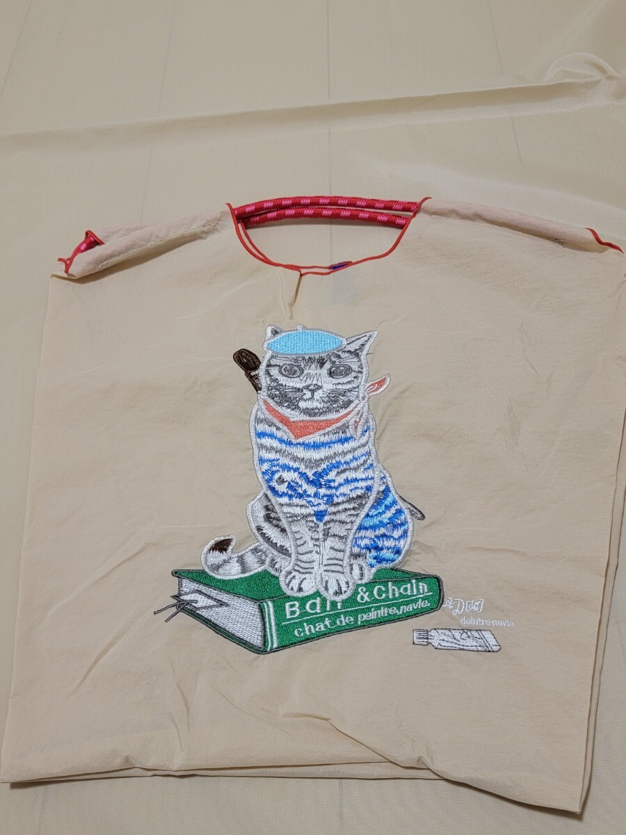 - 刺繍ロープエコバッグ(ベージュ猫M)ショルダーベルト付き