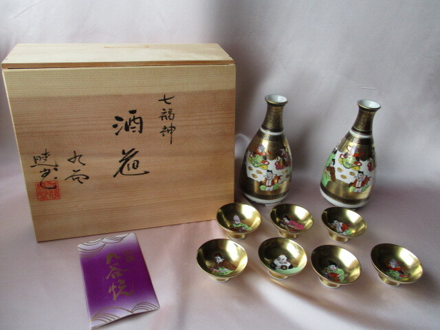 - 九谷 暁堂 七福神 金彩 酒器 徳利×2 猪口×7 共箱 未使用品
