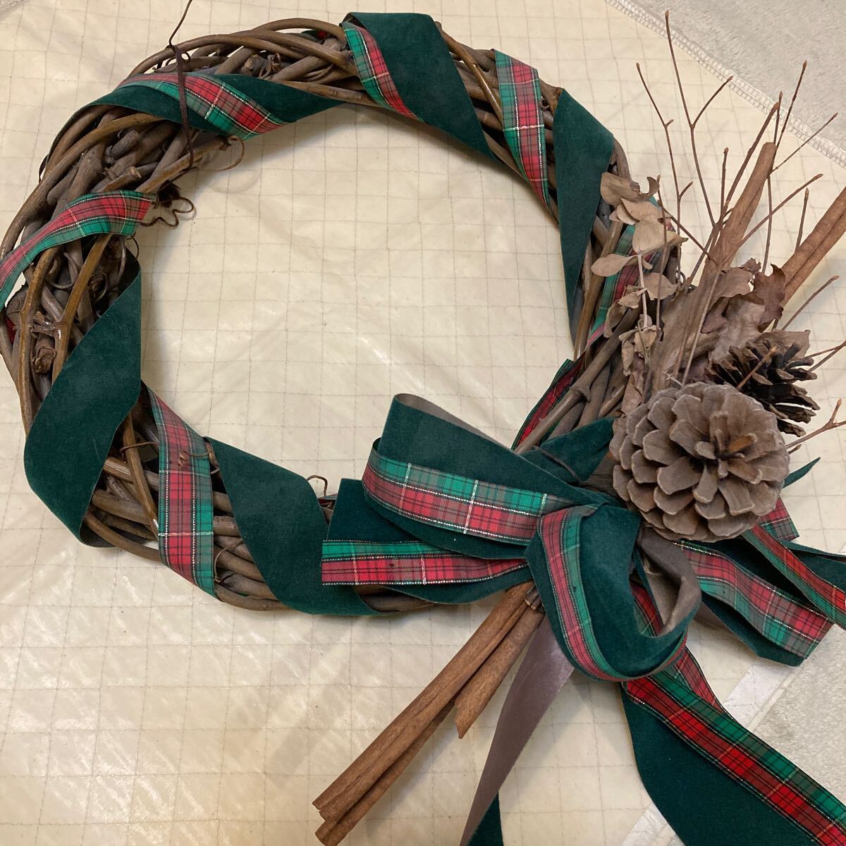 - 大きめ クリスマスリース 自然素材 リボン 松ぼっくり シナモン ユーカリ他 乾燥 ローレル 100g 希望者に