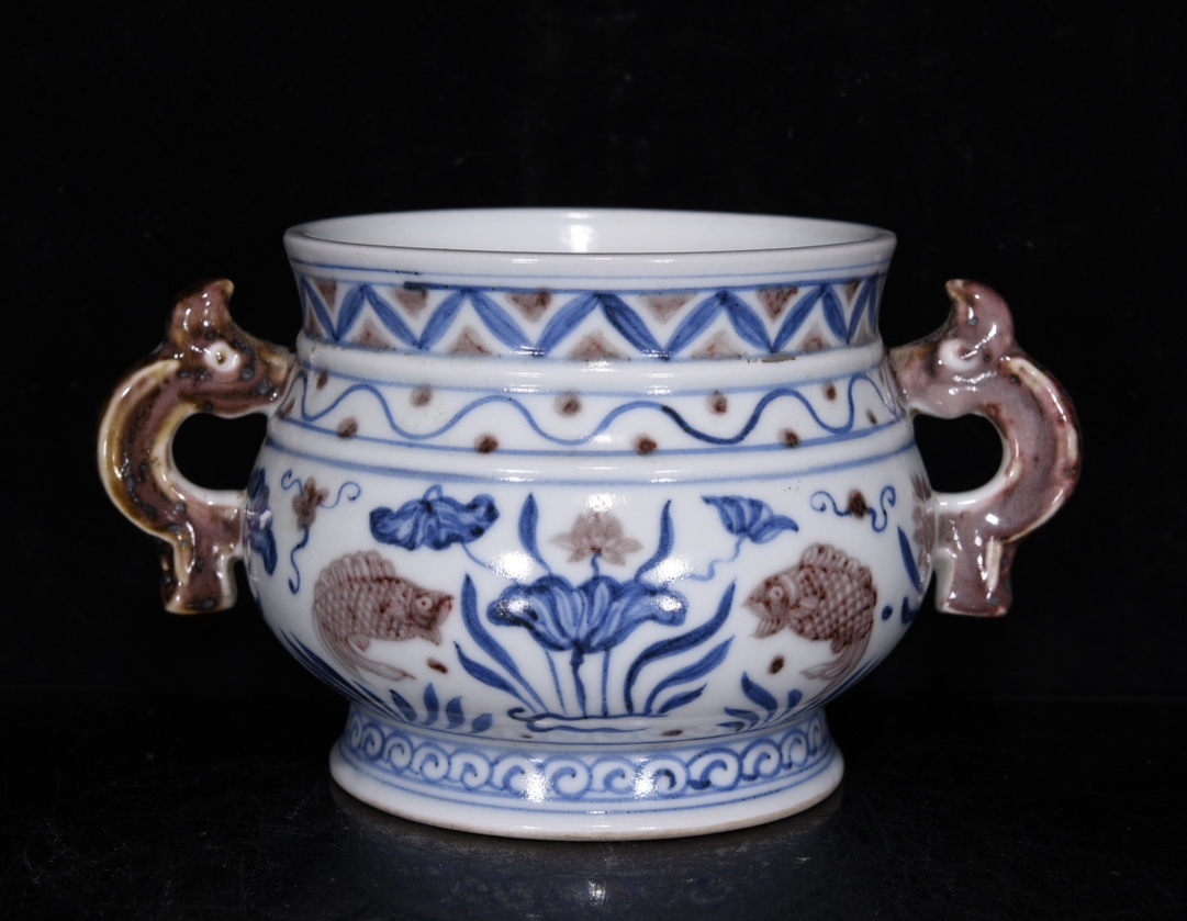 > ◆蔵出◆古美術 中国古玩 大明宣徳年製款 青花 釉里紅 荷叶魚藻紋双耳炉 時代物 AT08