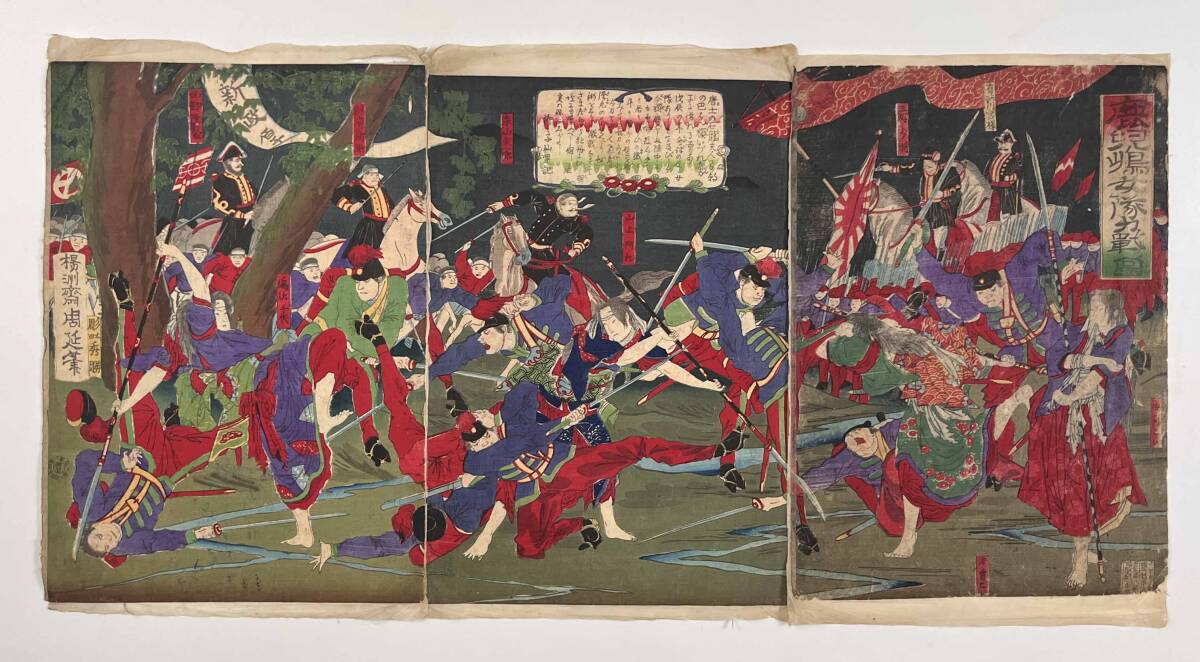 - 61110YN●浮世絵●真作『鹿児島女隊力戦ノ図』3枚 楊洲周延 西南戦争 明治10年 西郷隆盛●木版画 錦絵