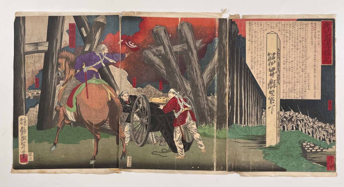> 61110YN●浮世絵●真作『鹿児島伝報記』3枚 鈴木年基 西南戦争 明治10年 西郷隆盛 桐野利秋●木版画 錦絵