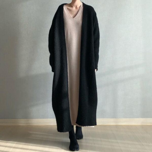 - カジュアル 簡素無地 ゆったり 暖かい ニットロング丈カーディガン レディースコート ~ F サイズ 黒YWQ485