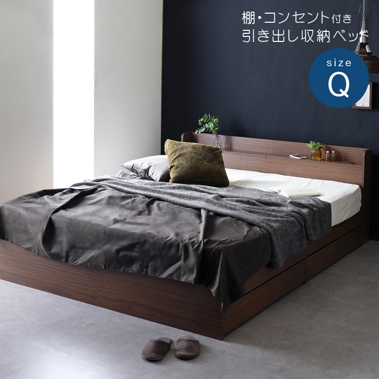 > 棚コンセント付き収納ベッド クィーン ウォールナット色 フレームのみ RUES ルース