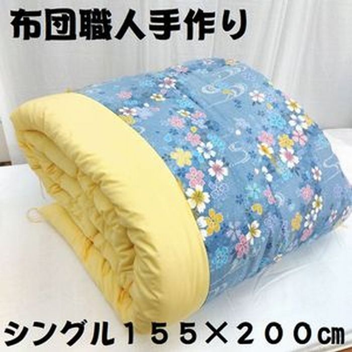 - 送料無料 お買得 全国ふとんコンクール入賞の職人が丁寧に仕立てた昔ながらの掛布団 シングル S 155×200㎝ 綿サテン生地 桜柄 ブルー●