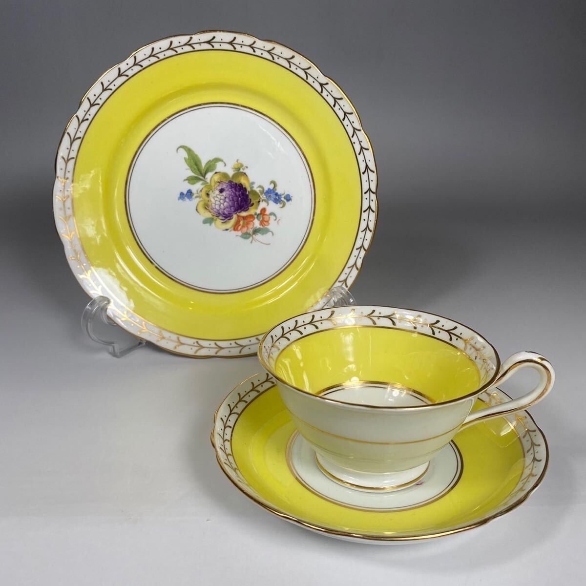 > 英国 アンティーク グロブナー イギリス カップ ソーサー トリオ インテリア 金彩 西洋美術 花紋様 フラワー プレート ケーキ皿 イエロー j