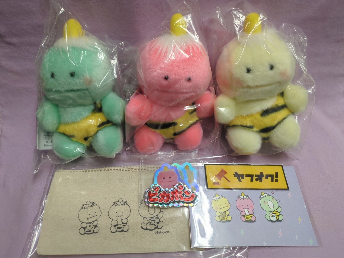 - セキグチ ピカポン ぬいぐるみ 3体 予約特典 ステッカー ポーチ 新品 未使用 昭和レトロ