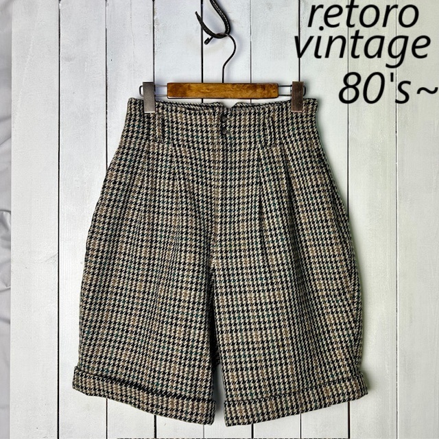 - レトロ古着 80s~ ガンクラブチェック柄 カシミヤ混 ウールキュロットワイドハーフパンツ M オールド ヴィンテージ 秋冬春 ●447