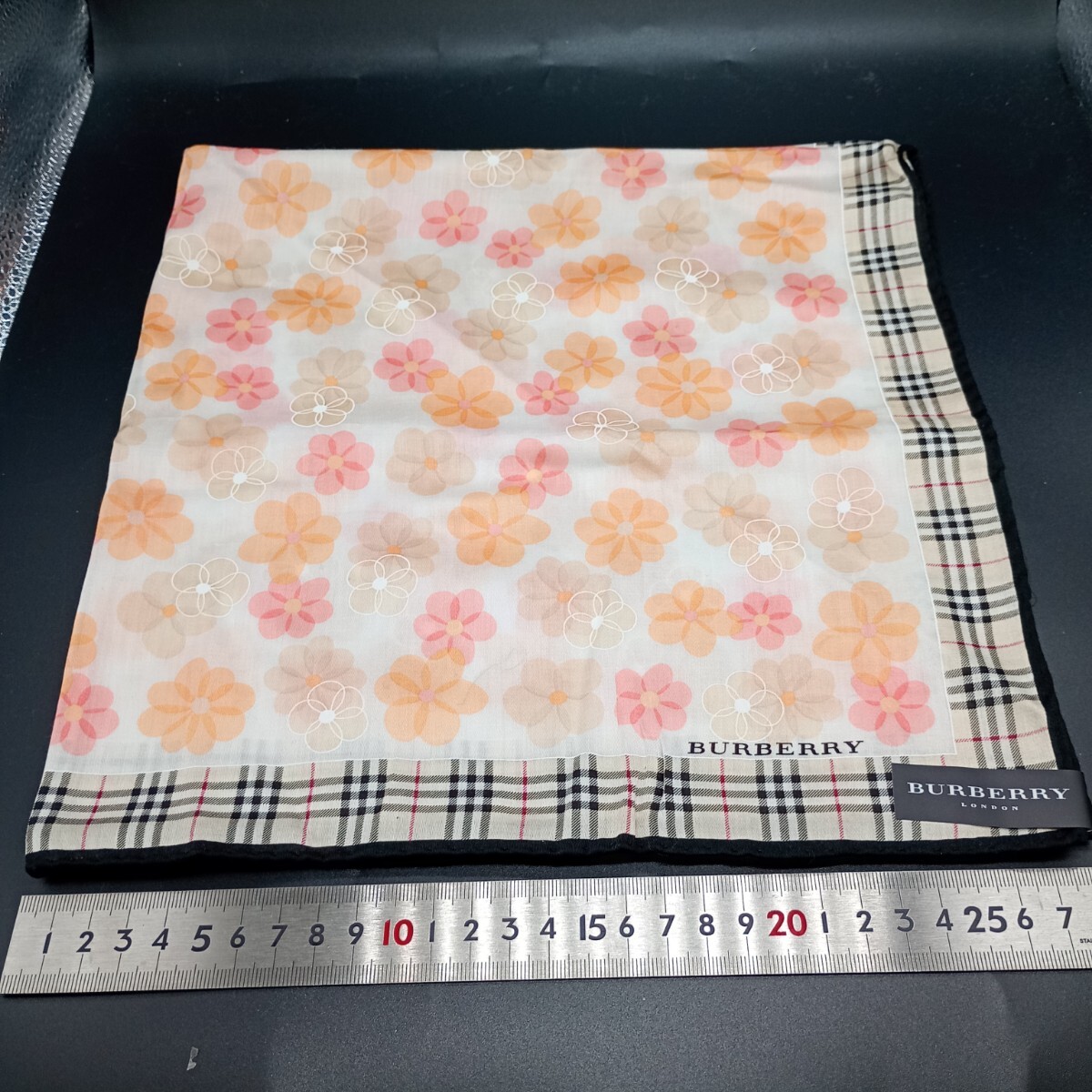 - BURBERRY バーバリー ハンカチ 大判 花柄 オレンジ チェック ふちブラック no.3009