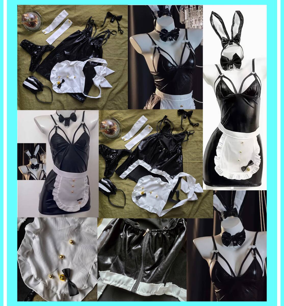 - ★超素敵★メイドコスチュームセット★光沢ブラック★ミニスカ★バックフック★エプロン、カチューシャ★Tショーツ★ネックリング★E167W