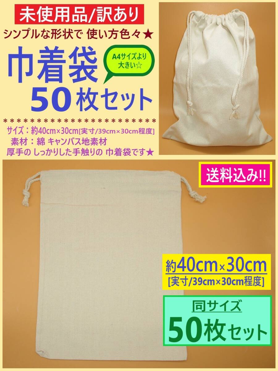 - 訳あり 未使用 無地 キャンバス地 巾着 袋 50枚 A 40×30 コットン 綿 布 バッグ 厚手 ラッピング 上履き 給食着 海外製 まとめ 大量 処分