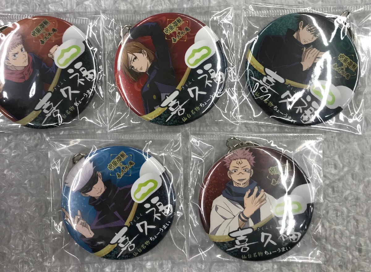 ★内袋未開封 喜久水庵 喜久福 呪術廻戦 コラボ 缶キーホルダー 5種セット 虎杖 伏黒 釘崎 五条 宿儺 グッズ●追跡番号付きのゆうパケット(クッション入り封筒)で発送致します。
