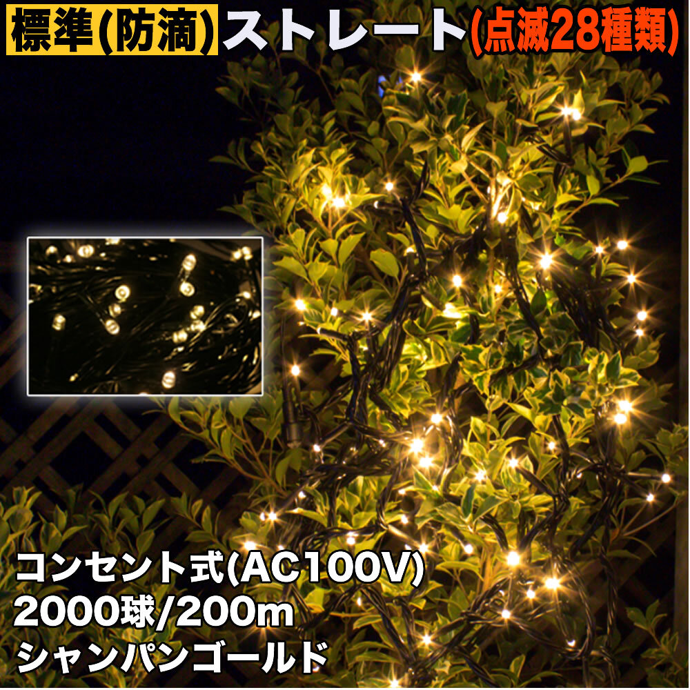 > クリスマス 防滴 イルミネーション ストレート ライト LED 2000球 200m シャンパンゴールド 電球色 28種点滅 Bコントローラセット