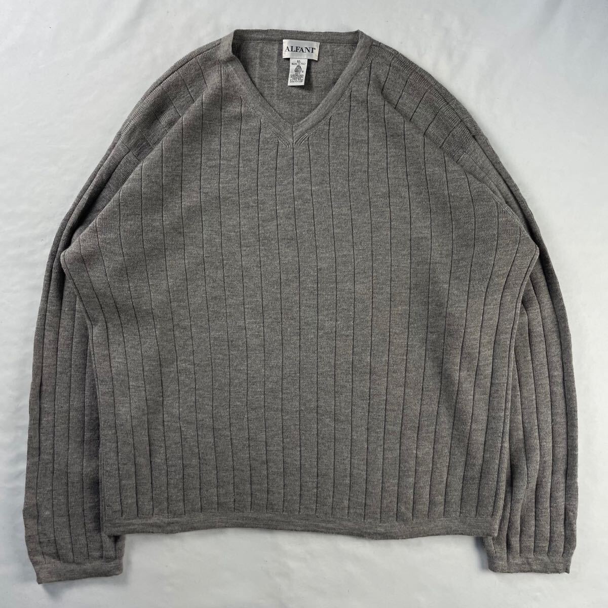 - US Vintage イタリア製 90s ALFANI ピュアニューウール100% Vネック 立体 3D 単色 プレーン 灰色 グレー シルバー リブ編み デザインニット