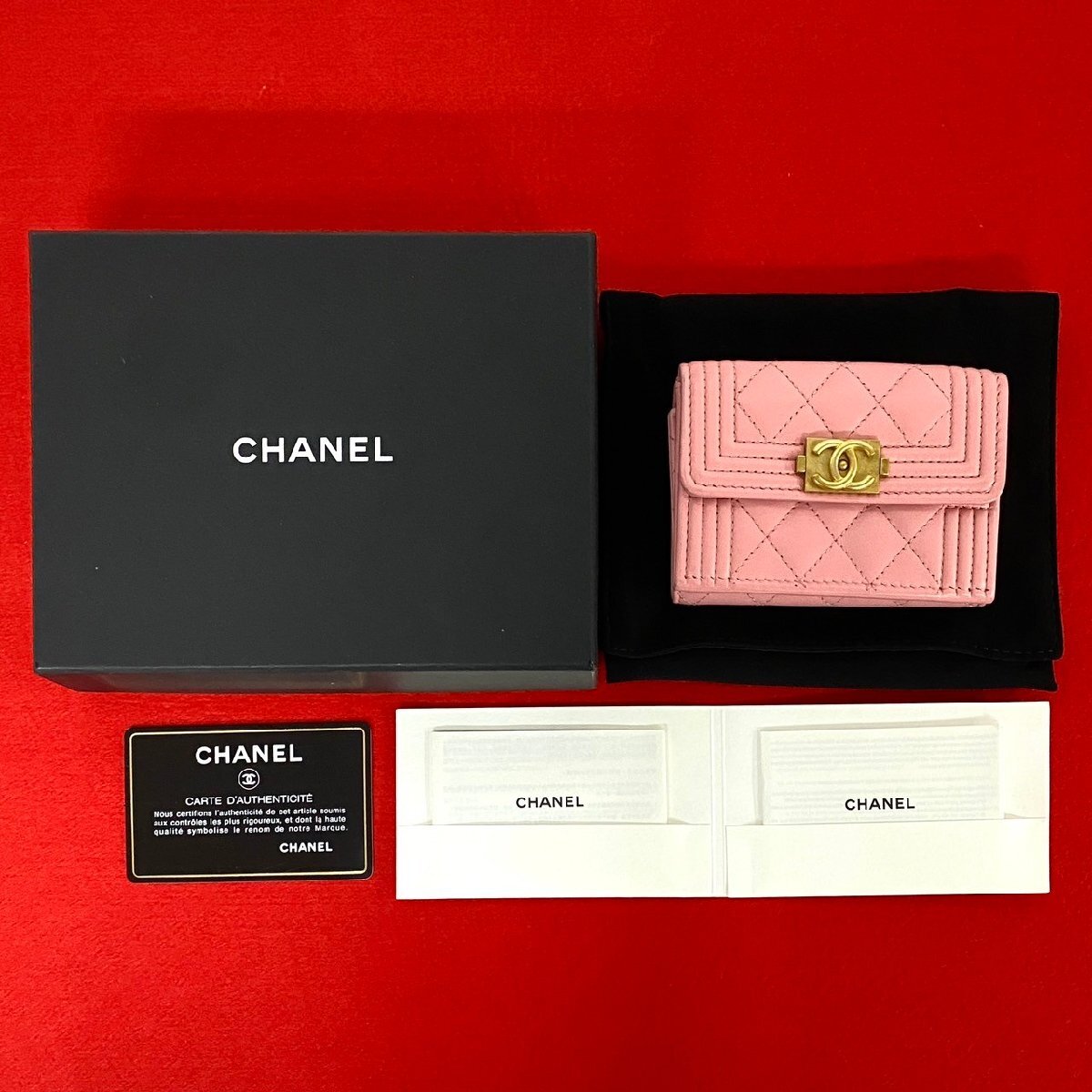 > ほぼ未使用 箱 袋付 カード シール有 CHANEL シャネル ボーイシャネル ラムスキン レザー 本革 三つ折り 財布 ウォレット ピンク 17920