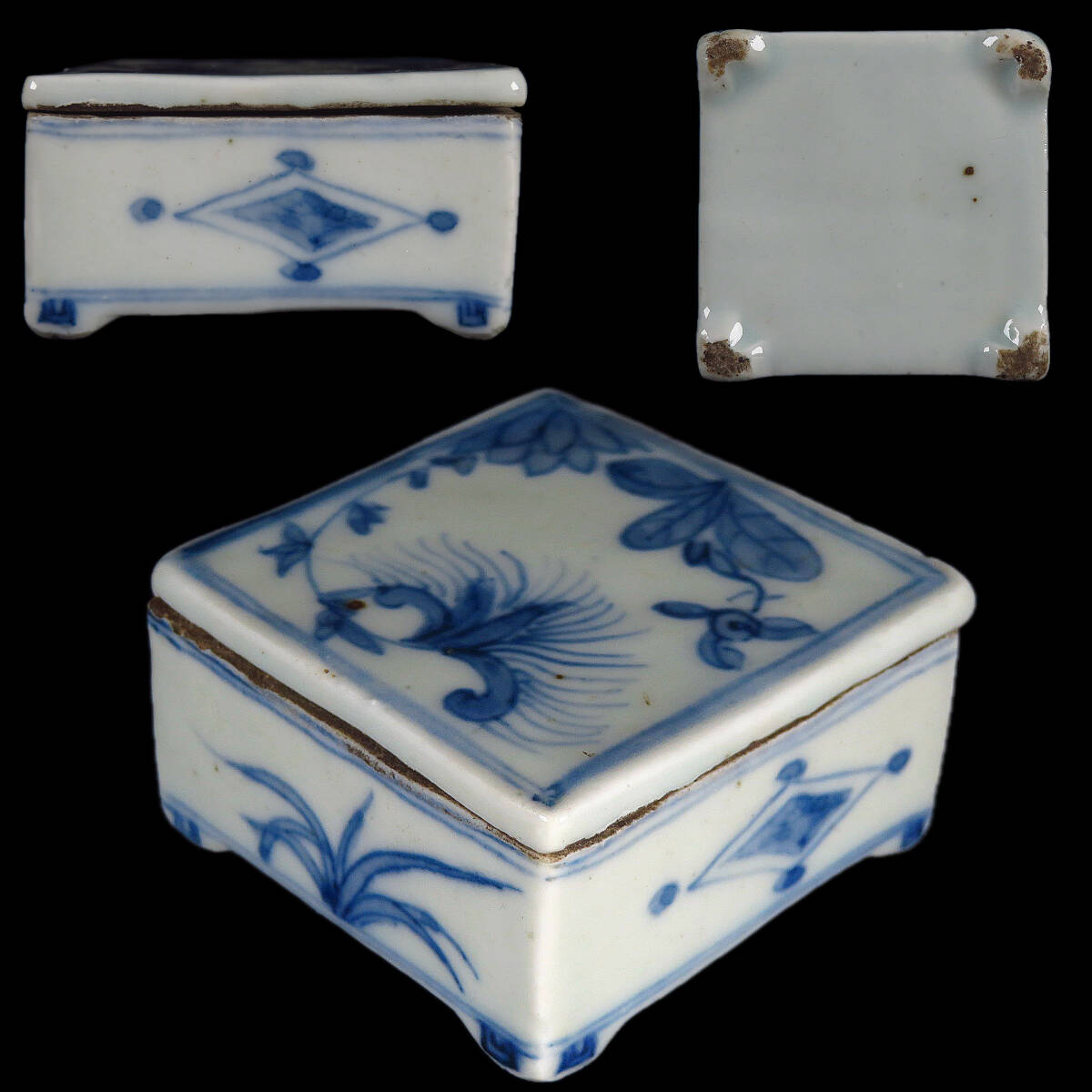 > 【SAKURAYA】コレクター整理品 図録同手【李朝 白磁青花草花文方合】方形合子 香合 時代物 高麗 唐物 書道具 骨董品 古美術品 高さ3cm