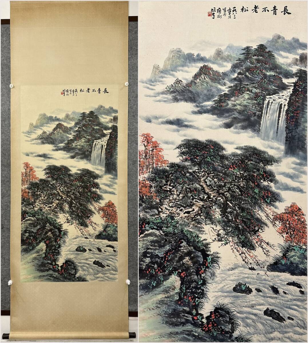- 古美術 掛け軸 中国・近現代 「黎雄才書」 紙本 【常青不老松図】 立軸 書道 巻き物 肉筆保証 唐物 古画 画心68x137cm LT-2412105