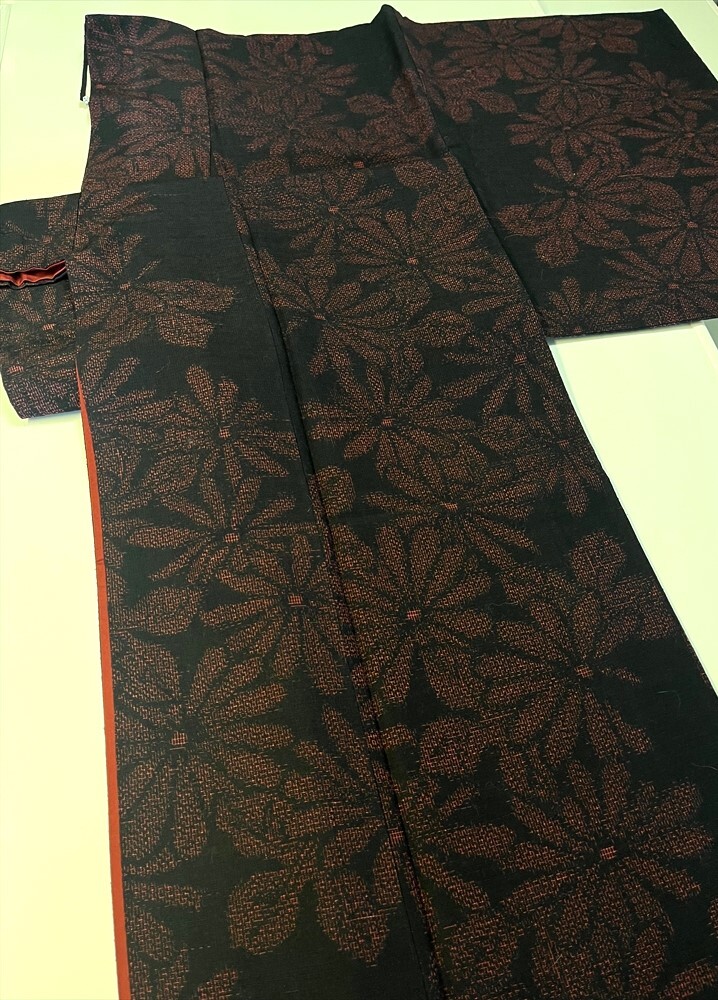 > 花とら●リサイクル着物 紬 結城紬 赤黒 菊 着用可能 リメイク 素材 細工用 241215