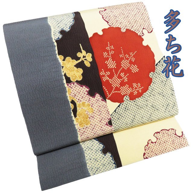 - 特選 名古屋帯 なごや帯 中古 リサイクル 正絹 仕立て上がり 全通 多ち花 雪輪に鹿の子模様 梅 淡黄色 鼠色 多色 きもの北條 A1130-17
