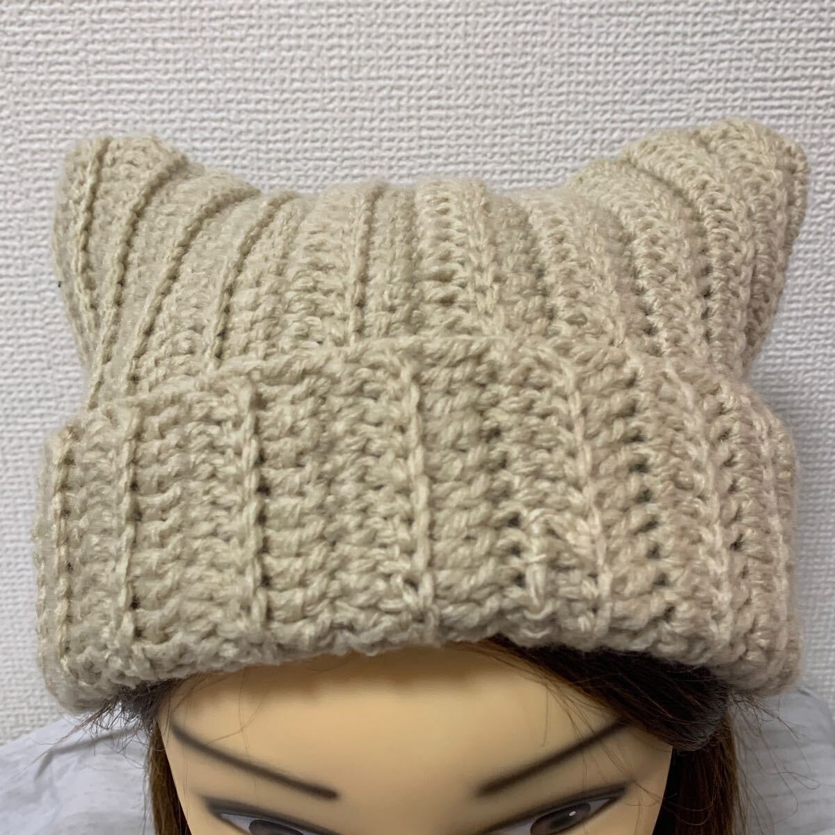 - 【a6】かぎ針編み シンプル キュート ねこ耳 ベージュ キャット ニット帽