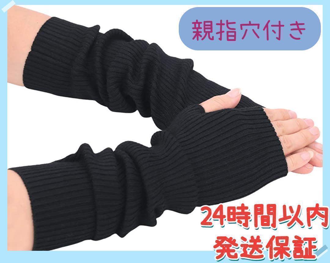 - アームウォーマー アームカバー 指なし 親指穴付き 防寒 ブラック