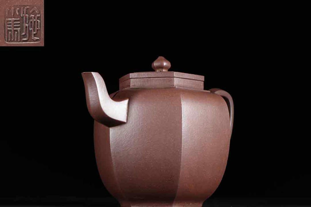 > ▼渡鶴羽▼P002時代朱泥 六方宮灯紫砂壺 在銘 施小馬/紫砂 煎茶道具 朱泥 茶壺