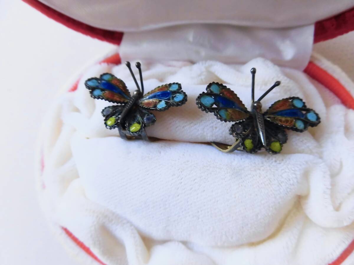 - ●逸品/七宝アンティーク*蝶々のイヤリング*青赤黄/ クリップ式/3cm大/刻印