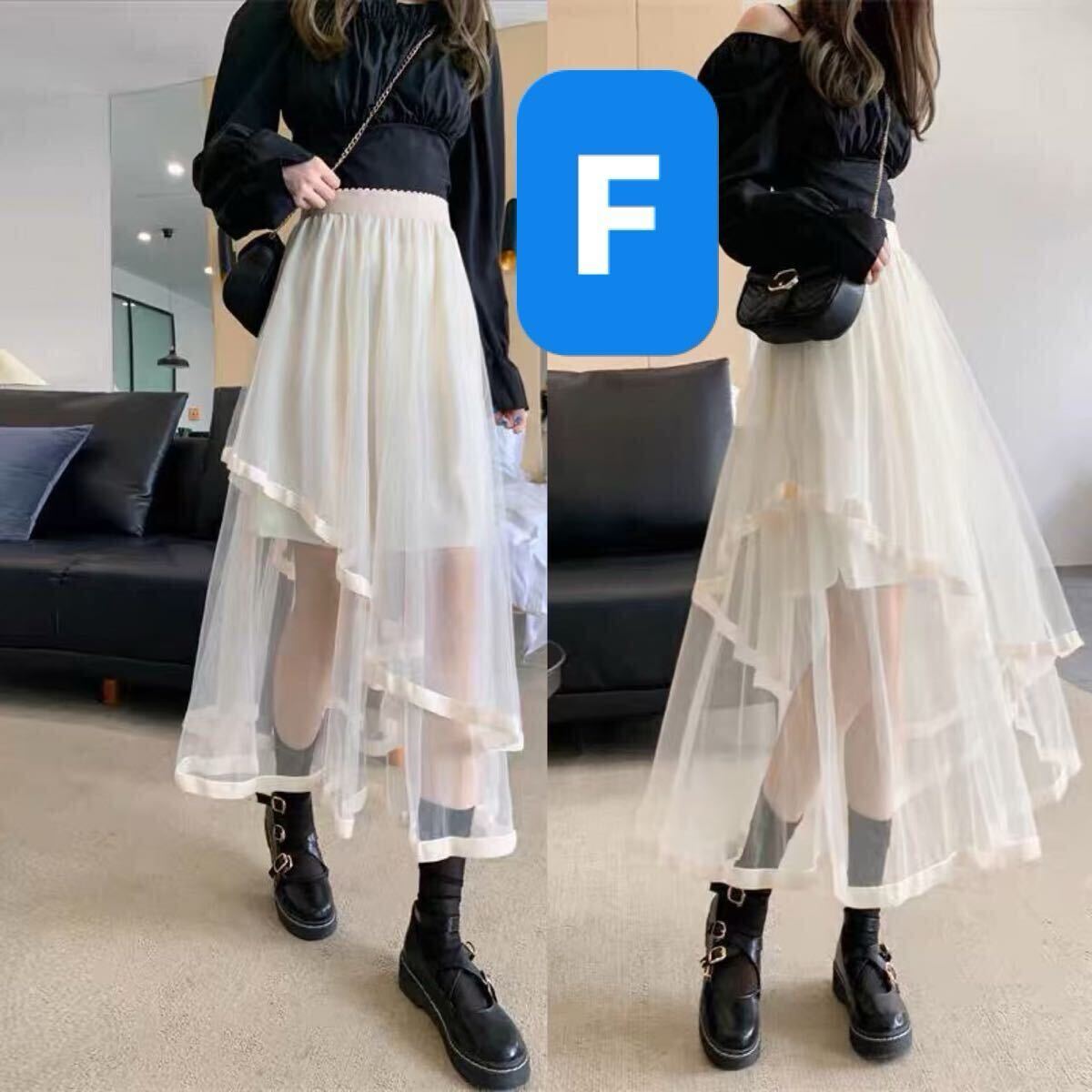 - ロングスカート アシンメトリー レース シフォン スカート フレアスカート シースルー 膝丈スカート アシメ モード トレンド ホワイト F