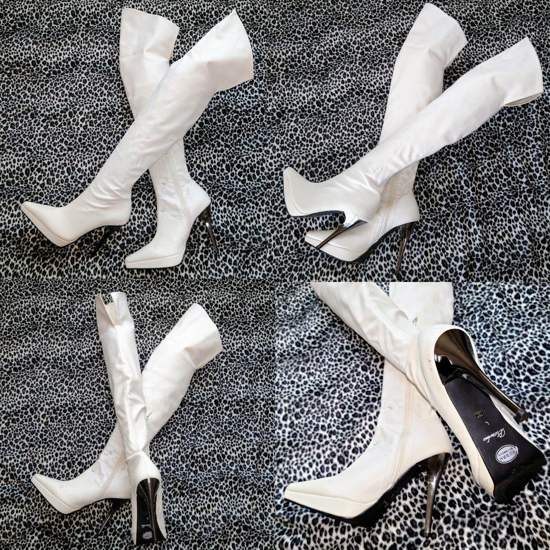 - 圧倒的美脚・ニーハイブーツ白・ピンヒール・ポインテッドトゥ・爪先尖り・ロングブーツ・ギャル系・キャバ嬢・中古・使用感あり・愛用品