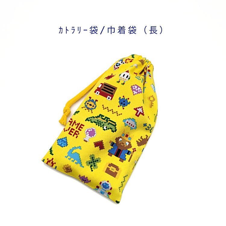 - カトラリー袋・巾着袋 長方形【ドット絵 ゲームの世界柄 イエロー】カトラリーケース コップ袋 ポーチ 怪獣 ピクセルアート ブロック絵
