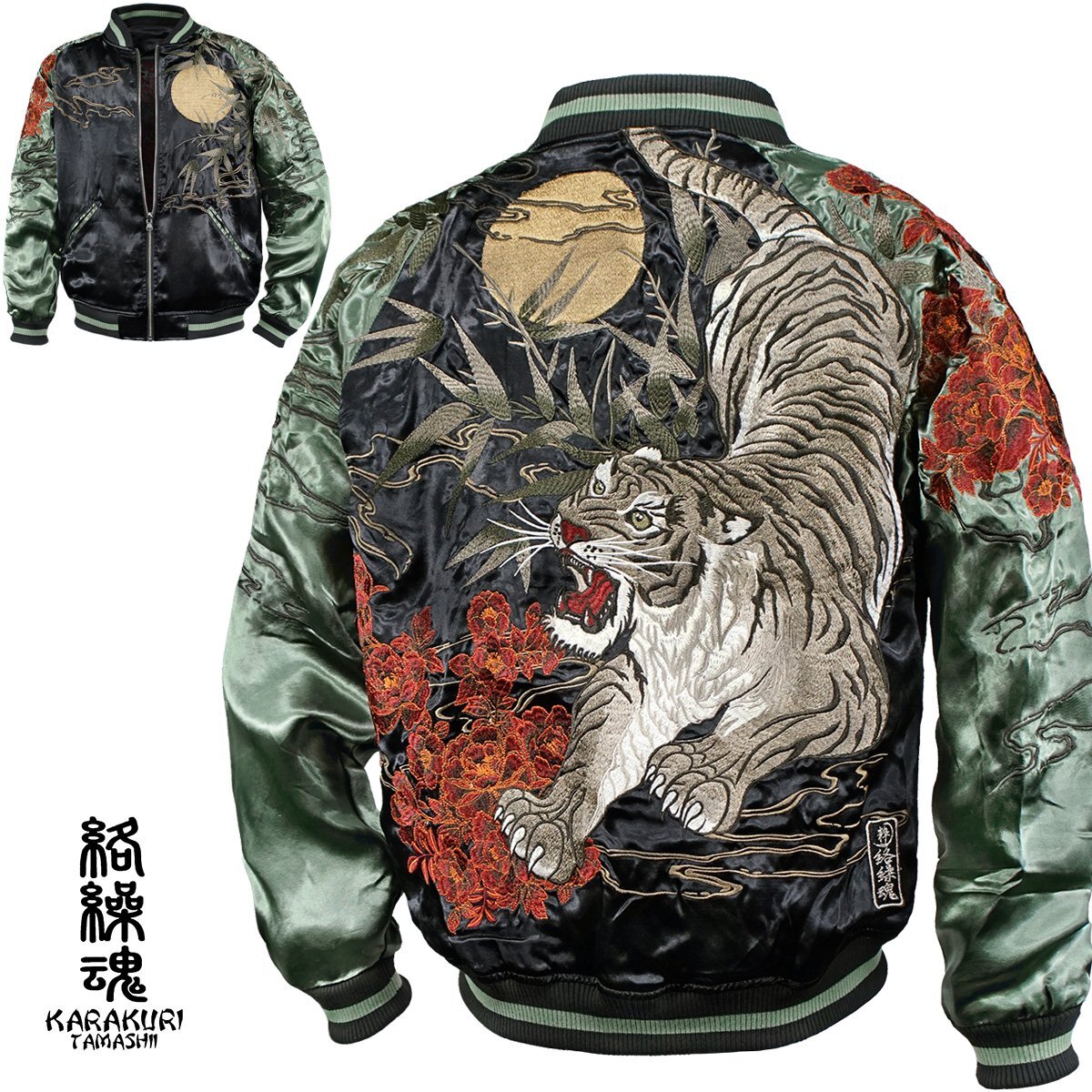 - 244033-25 絡繰魂 粋 スカジャン 満月竹虎 和柄 リバーシブル 刺繍 フルジップ サテン光沢ブルゾン メンズ(グリーン緑ブラック黒) XXL 寅