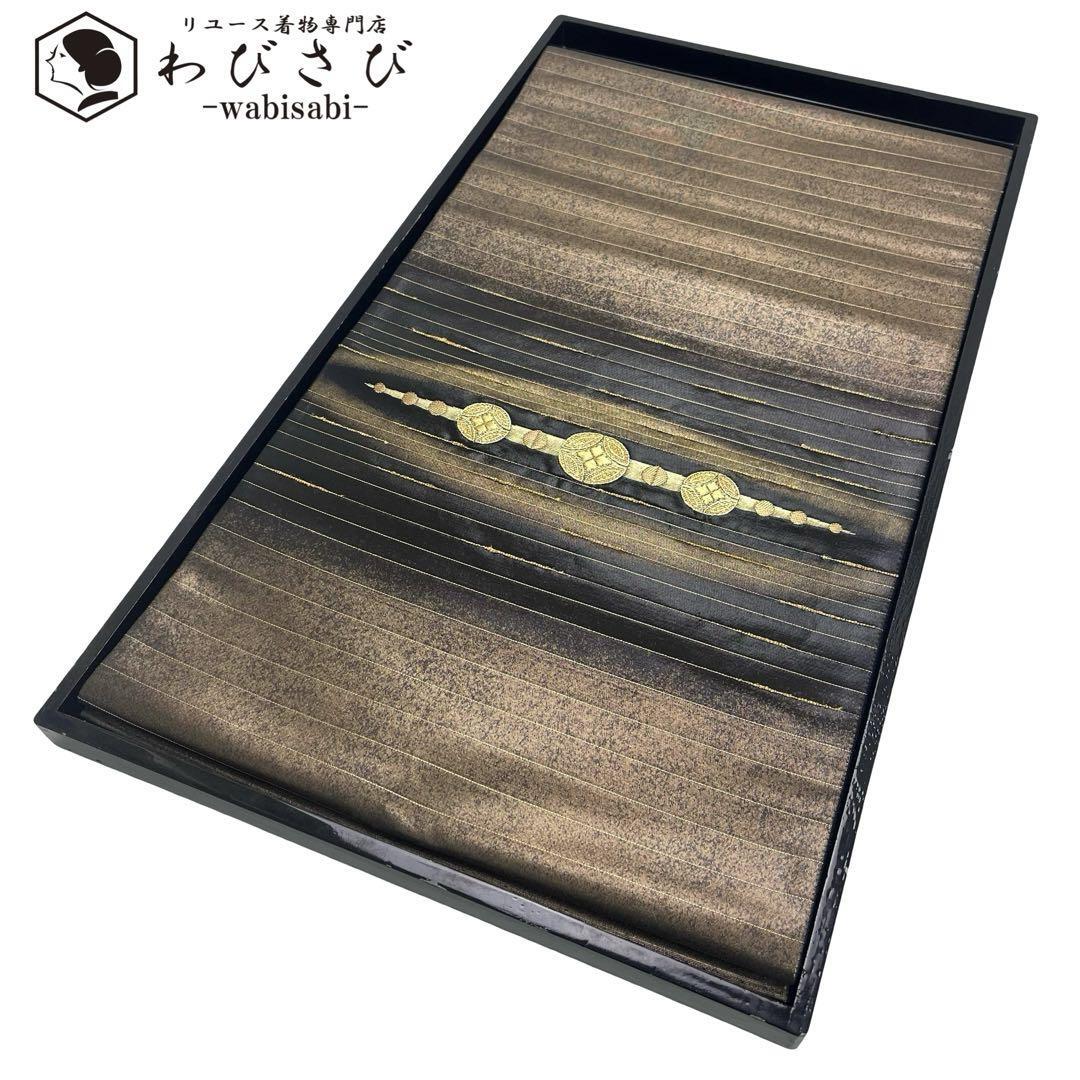 > 袋帯 西陣聚楽 モダンな花七宝柄 横縞織模様 金糸 黒色 O-4559 着物 きもの kimono 和服 和装 中古 リサイクル着物 【送料無料】