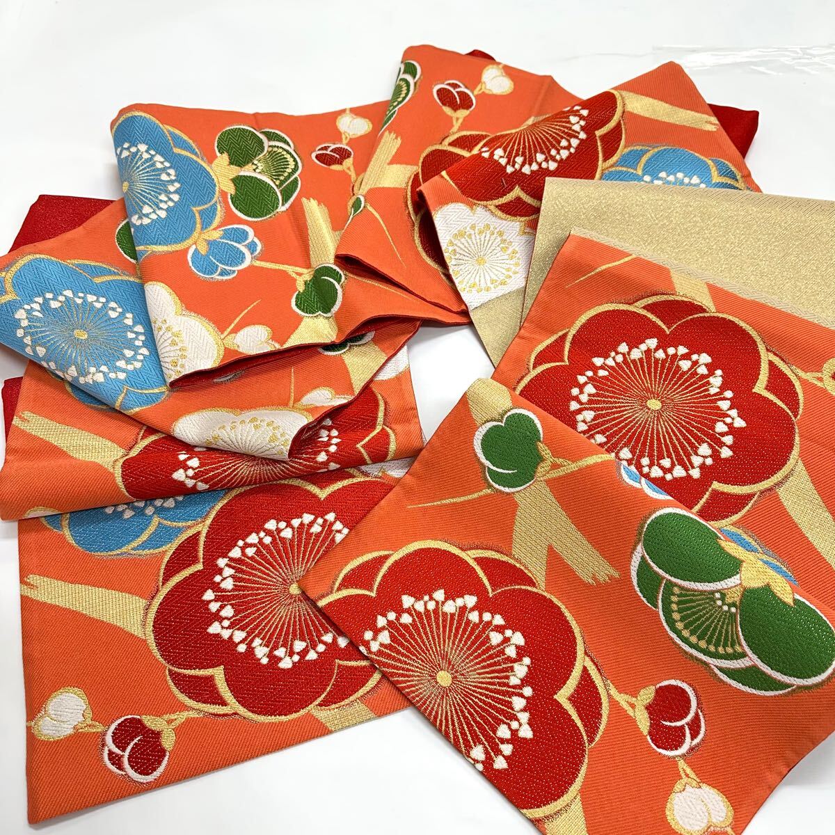 - 【七福】c425 振袖用帯 豪華 高級品 正絹 袋帯 六通 金糸 オレンジ色に梅 華やか 成人式 結婚式 お祝い