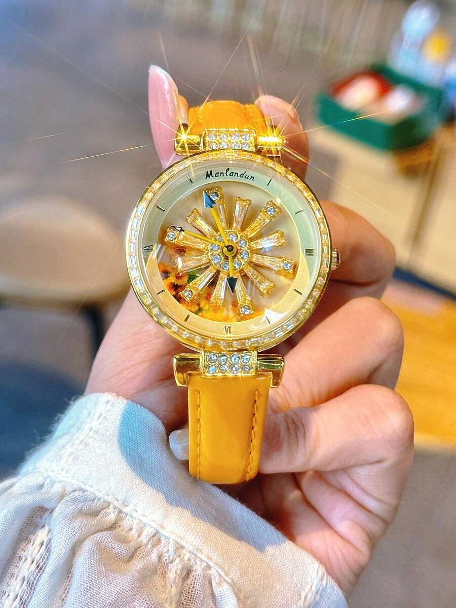 - 腕時計 レディース クォーツ 1個 透明な背面、ラインストーン装飾、回転ギャラクシーダイアル、ひまわりデザイン、ステンレススチール